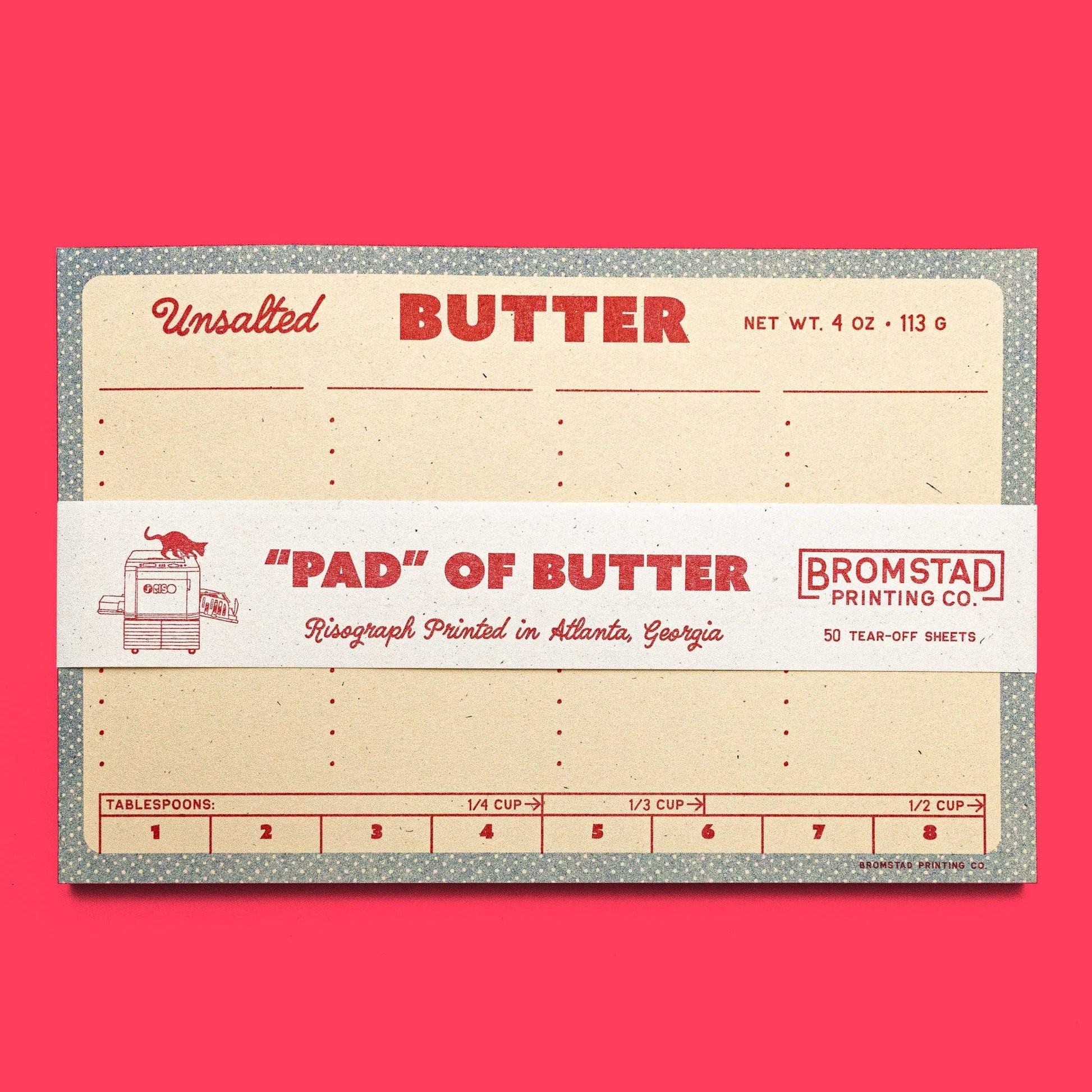 Bromstad Printing Company is a one-woman risograph design studio in Atlanta, Georgia creating delightful paper goods to bring a smile to your face no matter the occasion. Our goal is to brighten the day with our vibrantly colored greeting cards, prints, and calendars while spreading the gospel of risograph. Everything is designed, printed, and assembled by hand in Talia Bromstad's home studio under the supervision of the three BPC feline mewses - Stuart, Nadine, and Sylvia. Printed on FSC-certified papers with recycled content, package our prints with recycled backer boards, and are always looking for ways to lessen our environmental impact.