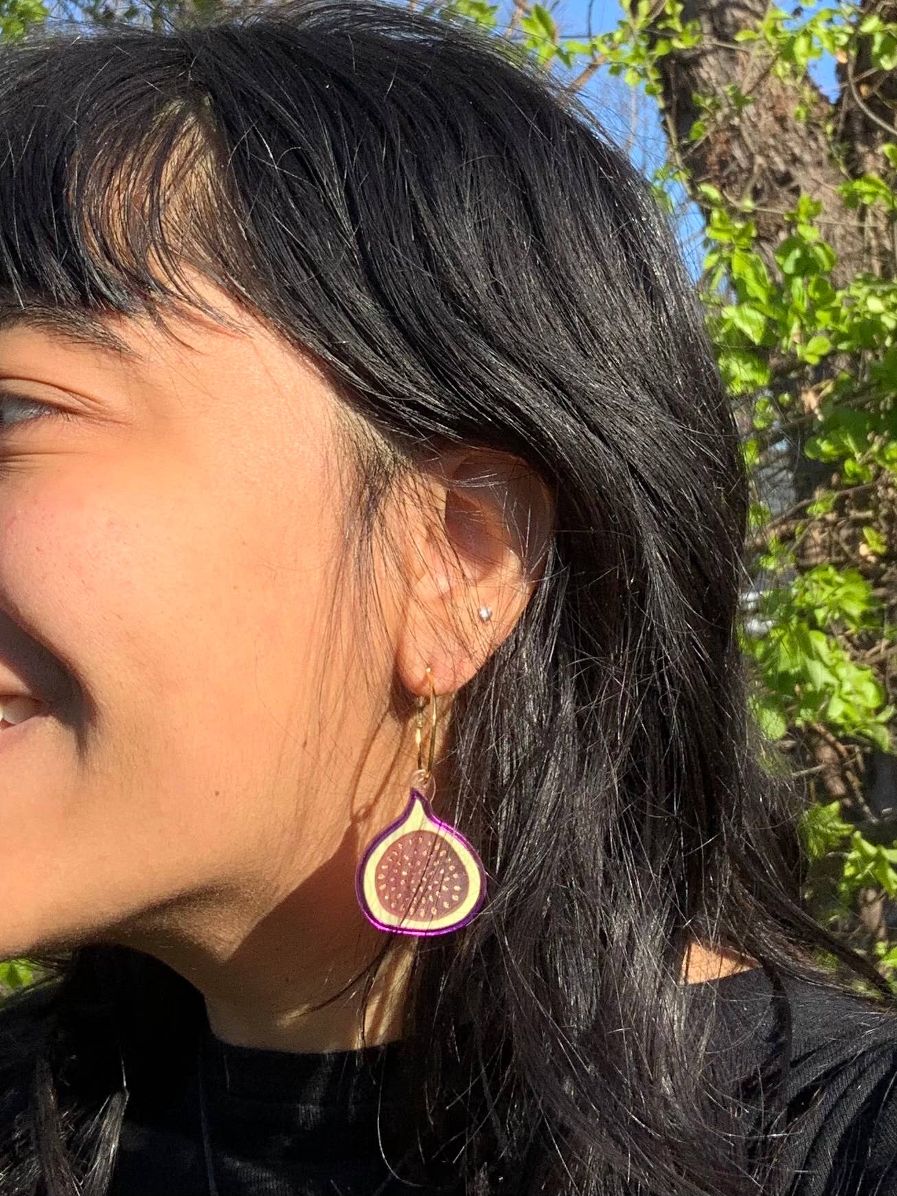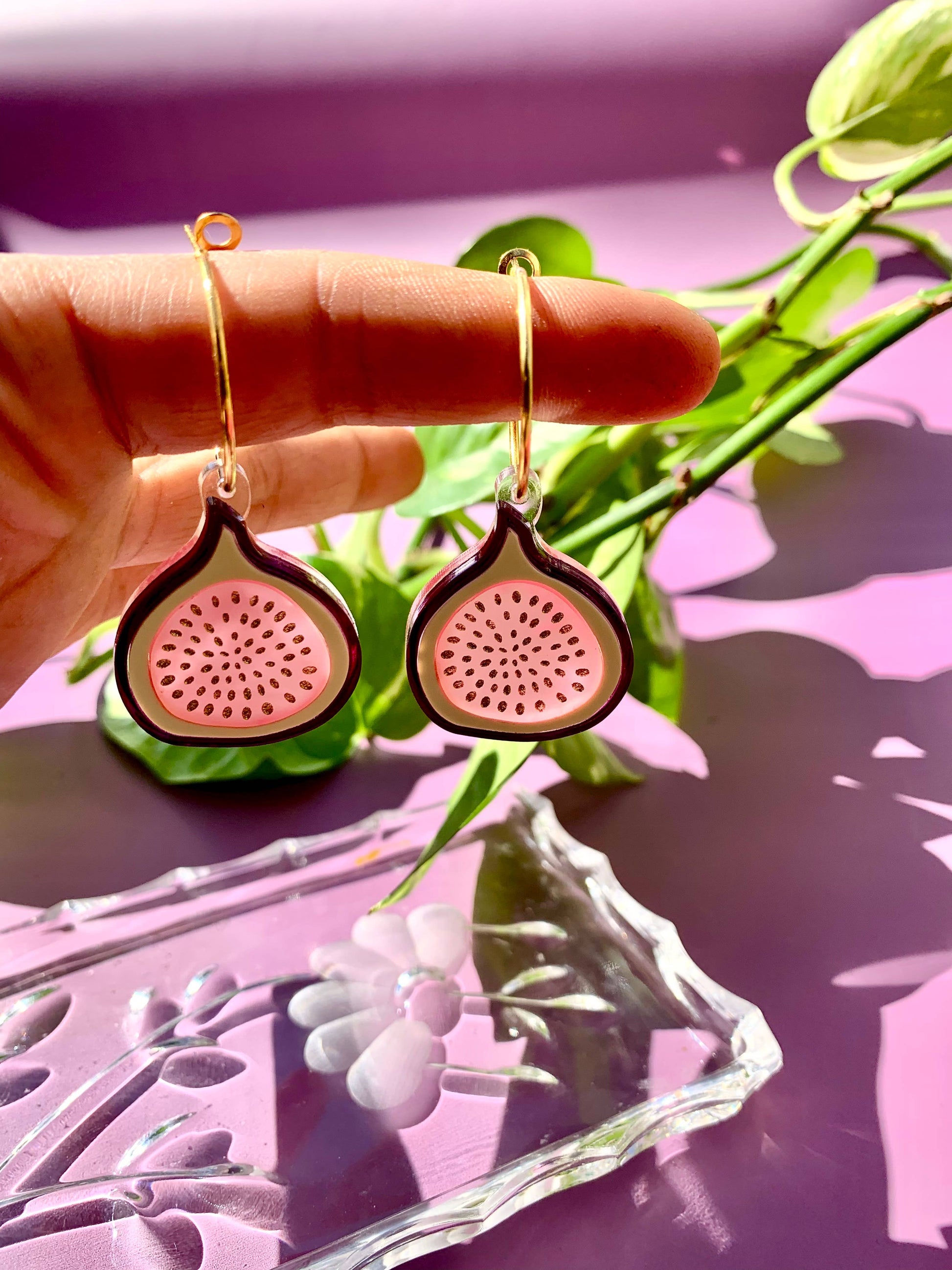 The sweetest figs for your ears! Made from an original design and laser-cut acrylic. Each piece is handmade, so slight differences can be expected. These are finished with hypoallergenic, anti-tarnish gold-plated hoops.
