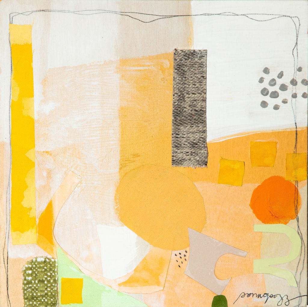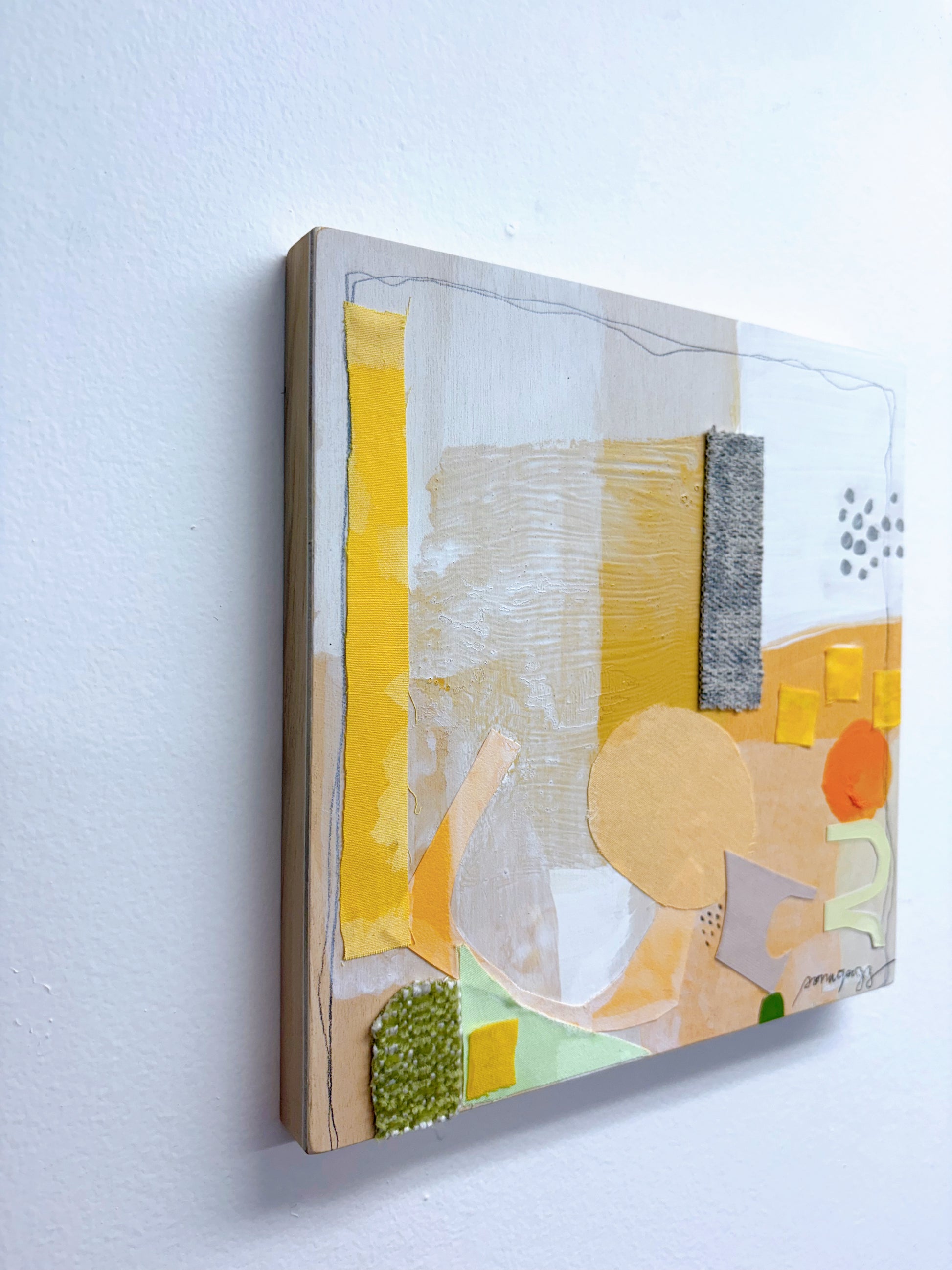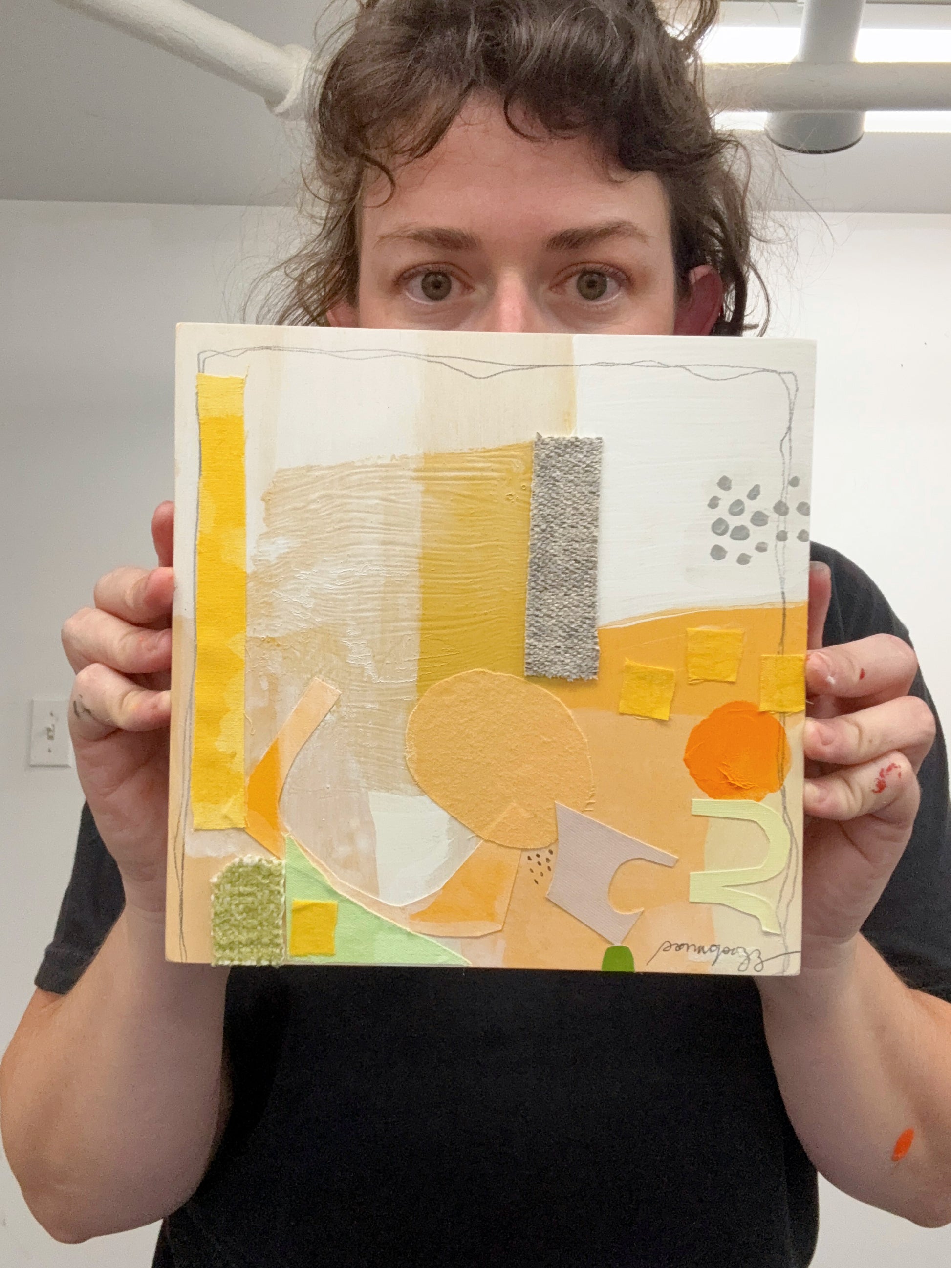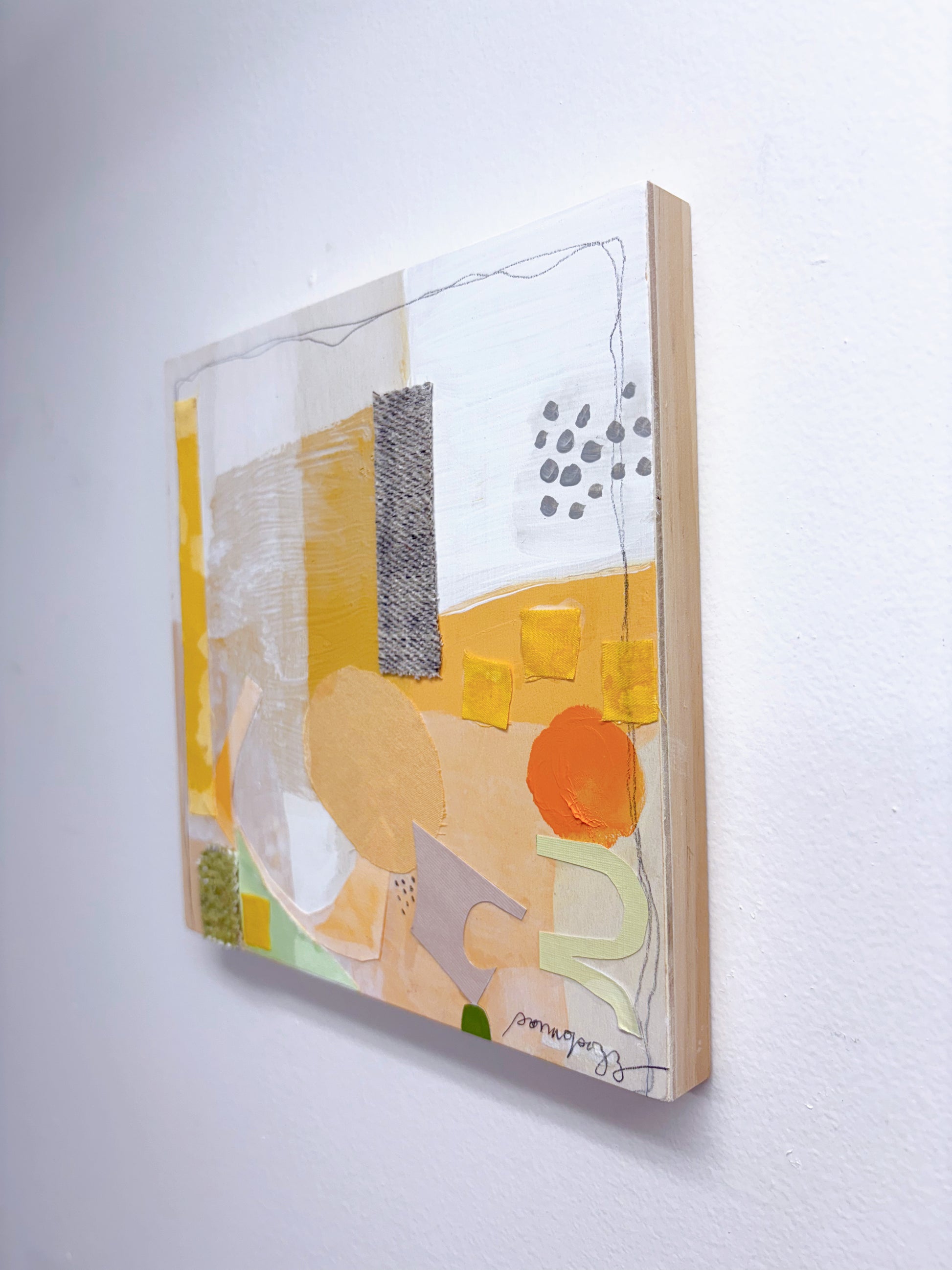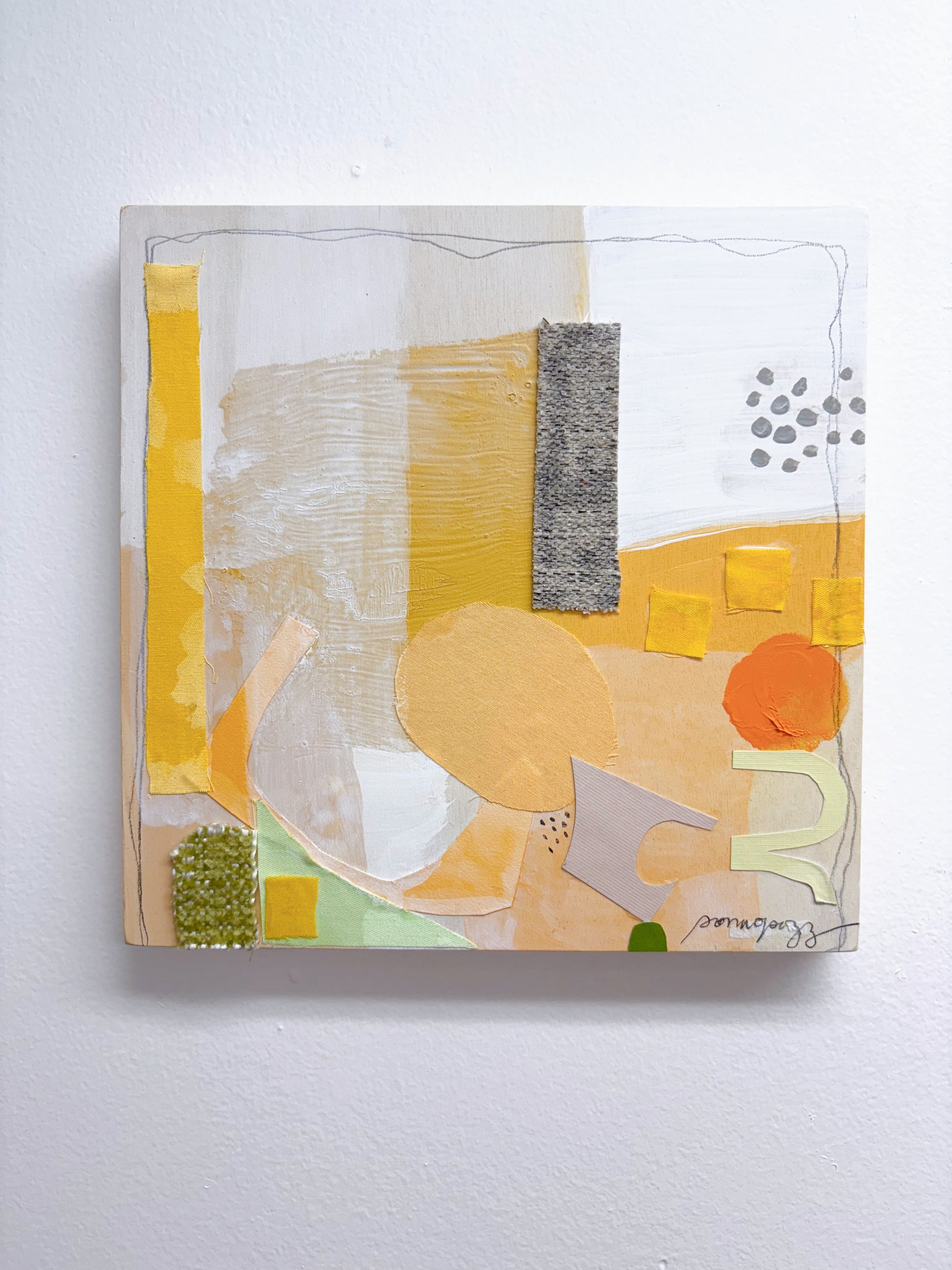 "Iowa Pacific" is an original, mixed media painting created by Adrianne Hawthorne Thomas (Ponnopozz) in 2025. The painting was created with acrylic, gouache, oil pastel, colored pencil and collage. The piece is signed in the lower right corner and is painted on a wood block.