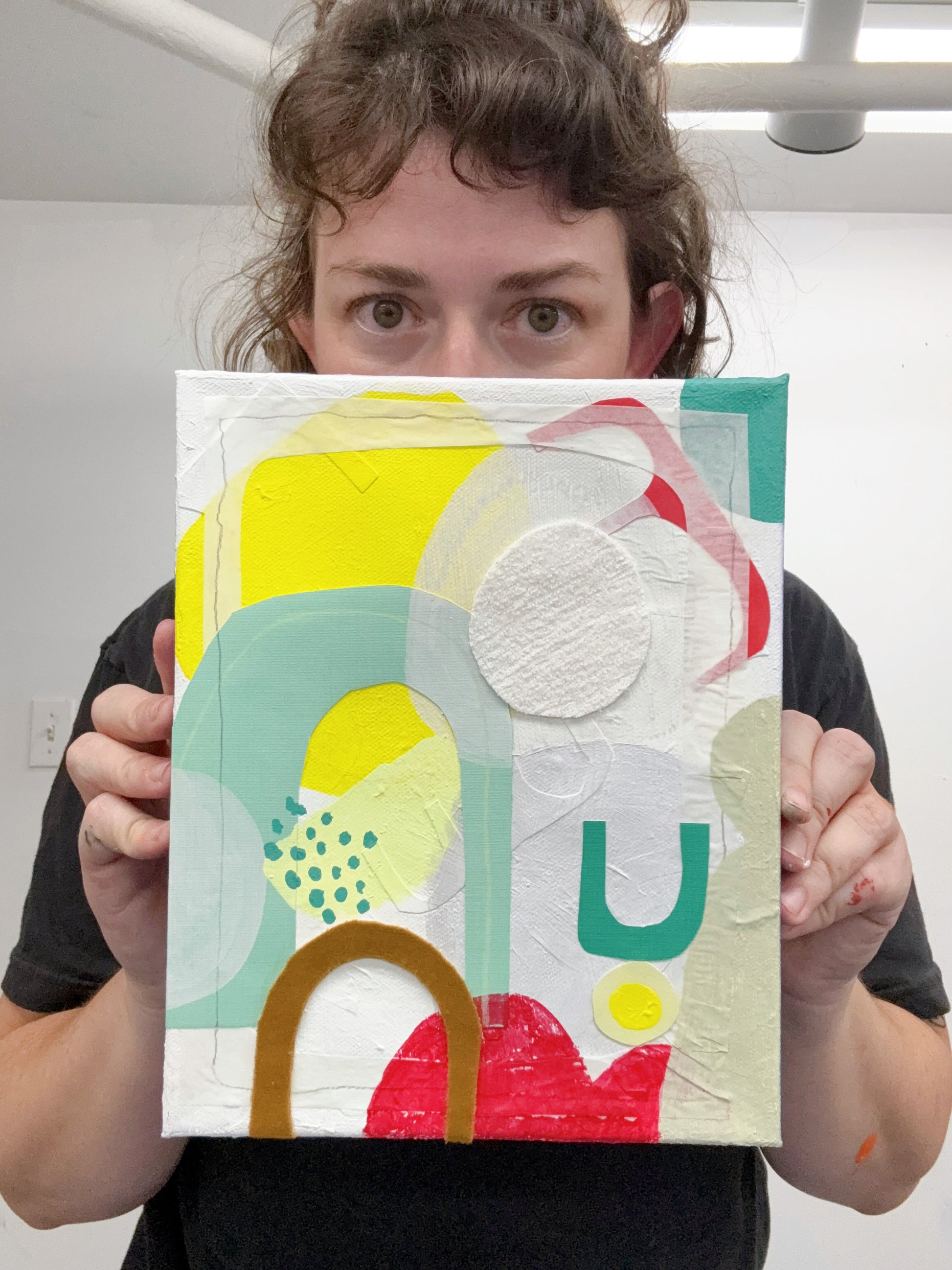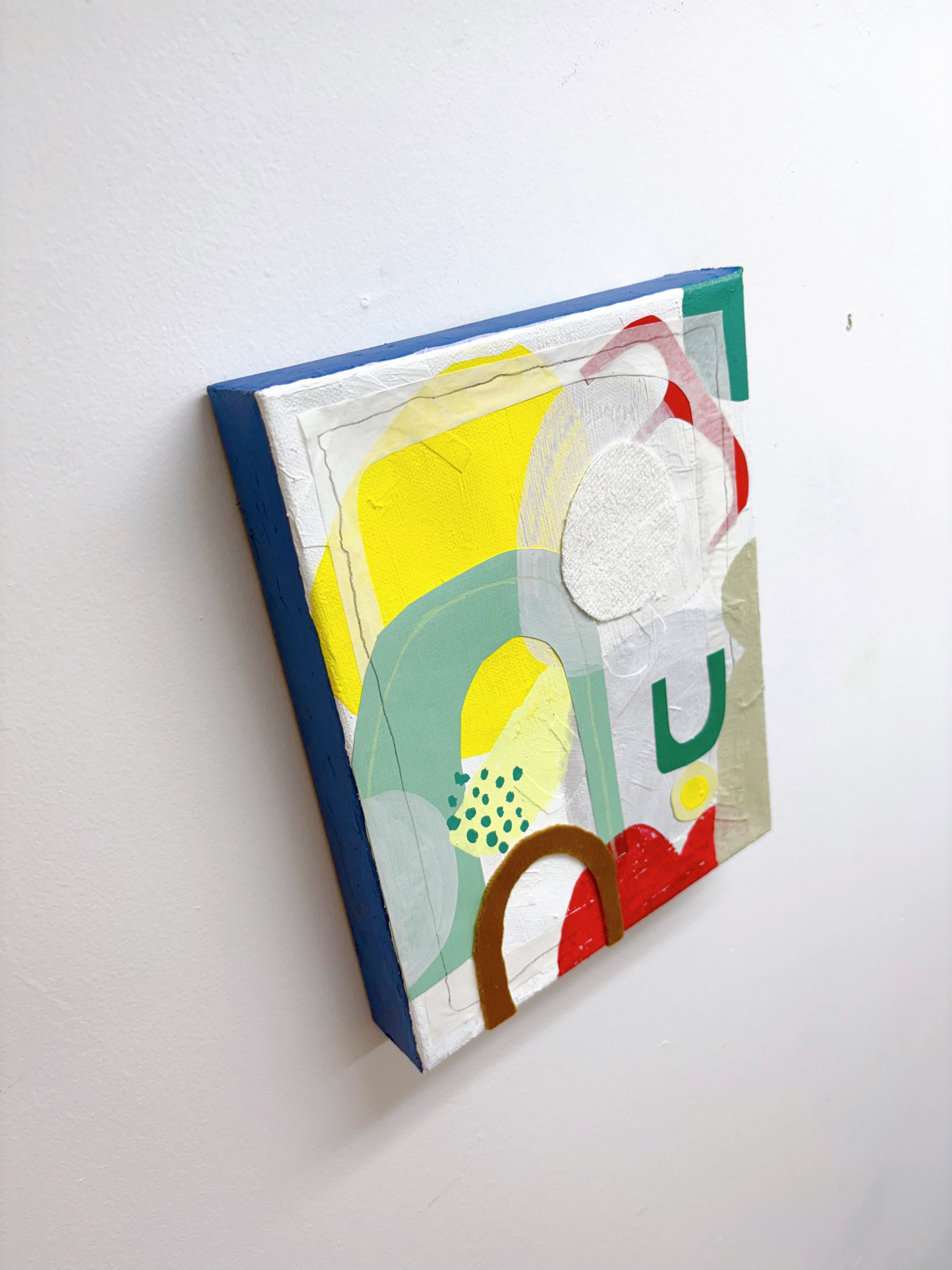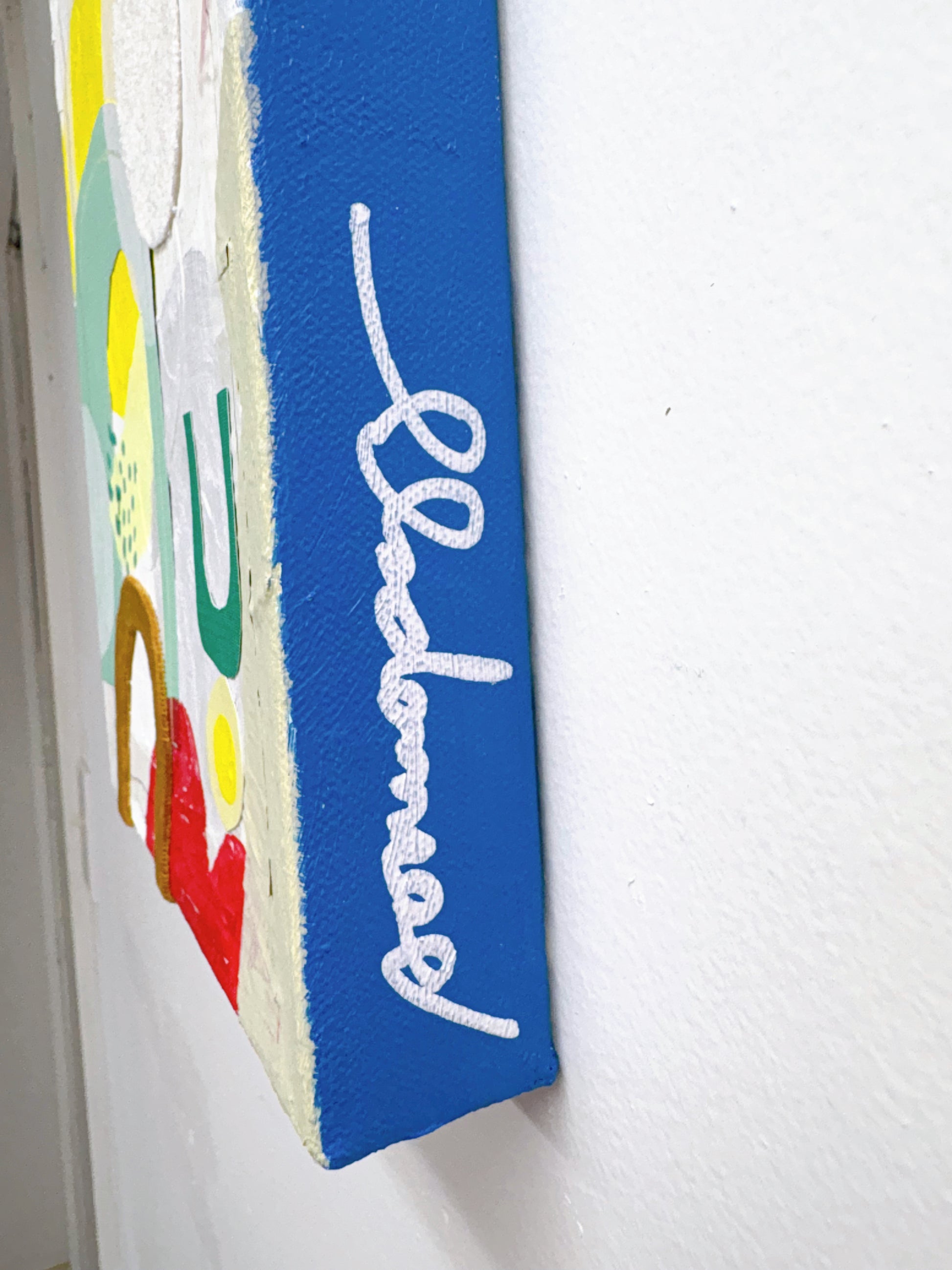 "Quincy" is an original, mixed media painting created by Adrianne Hawthorne Thomas (Ponnopozz) in 2025. The painting was created with acrylic, gouache, oil pastel, colored pencil and collage. The piece is signed in the lower right corner and is painted on a wood block.