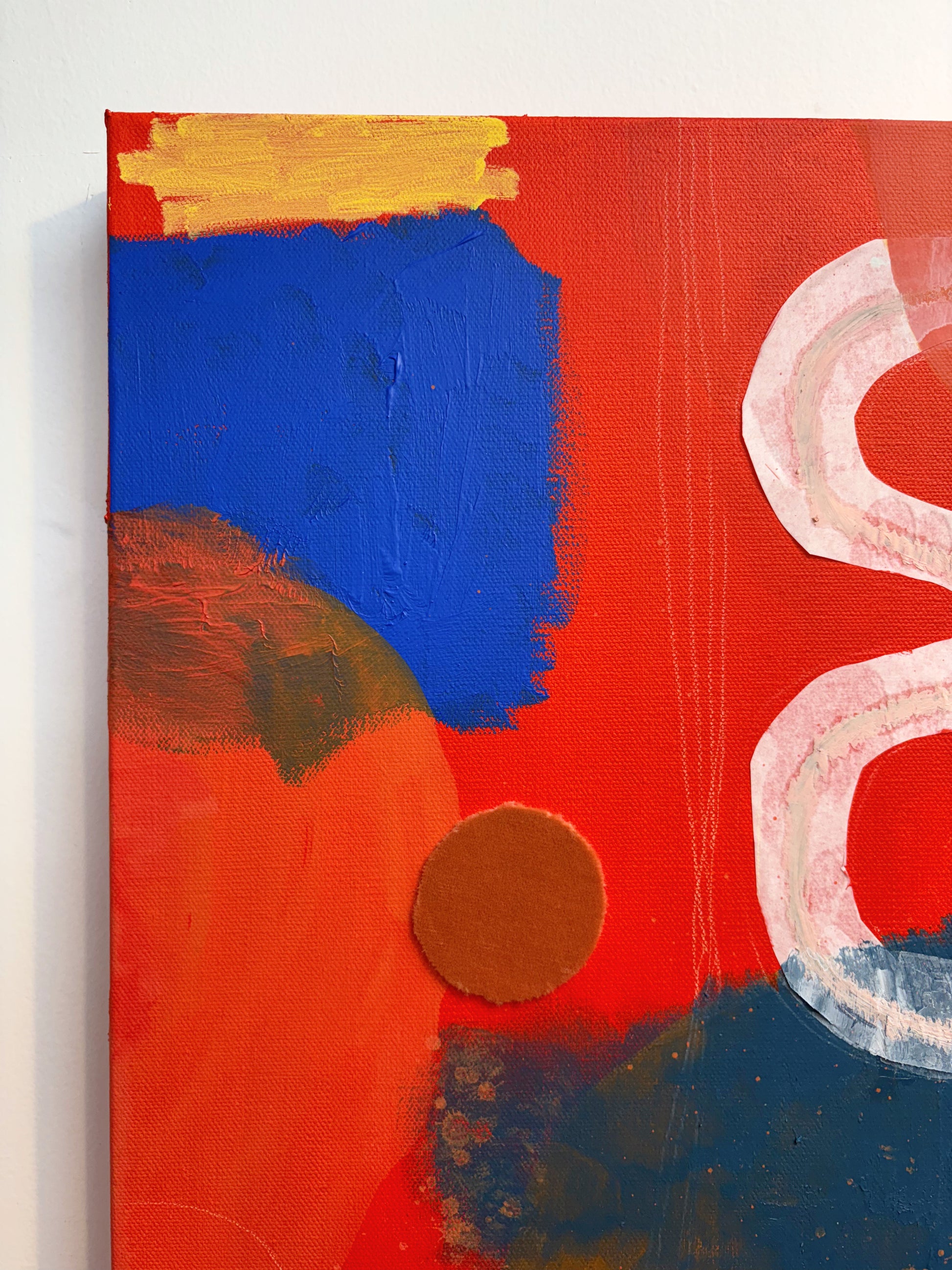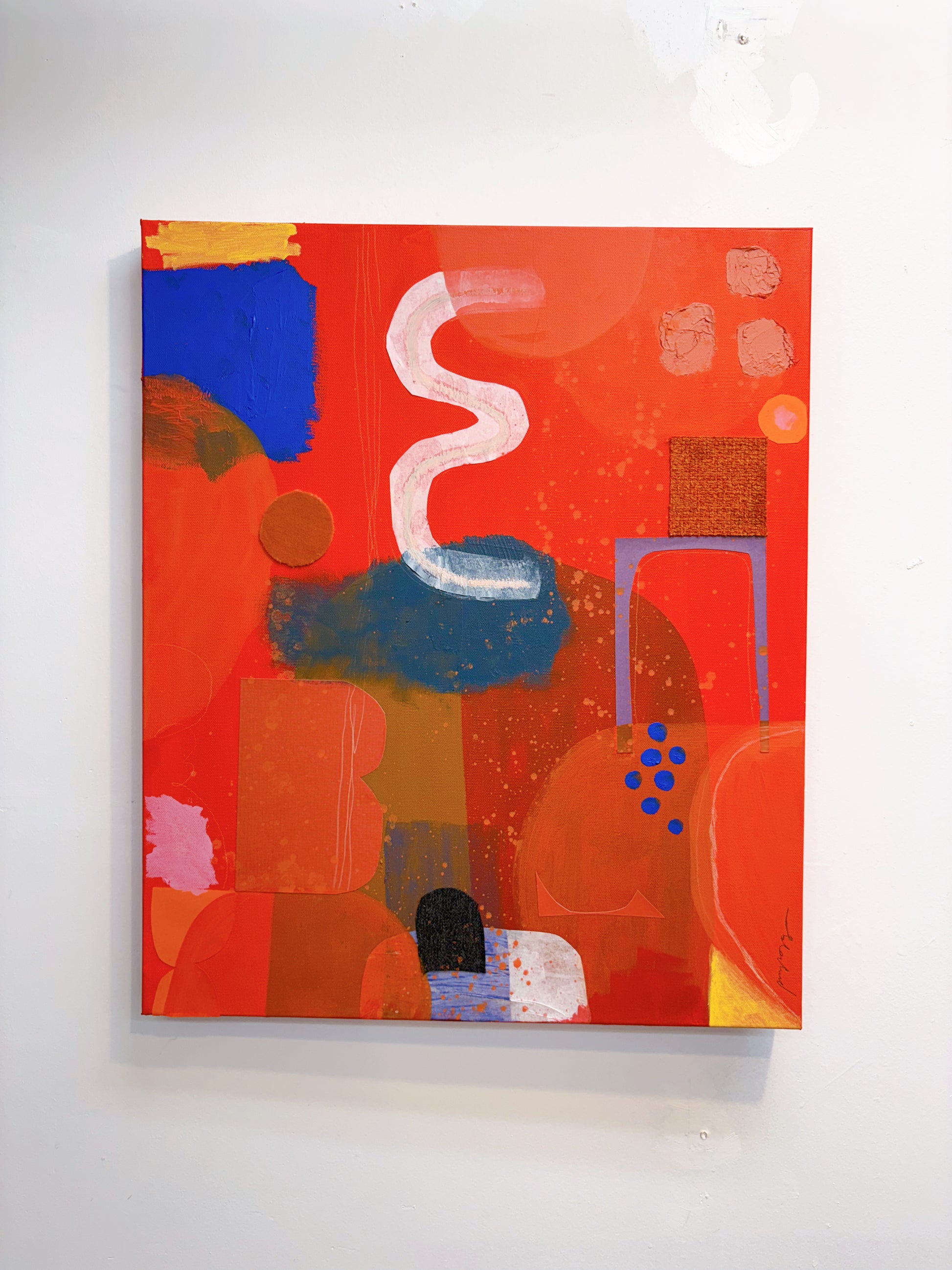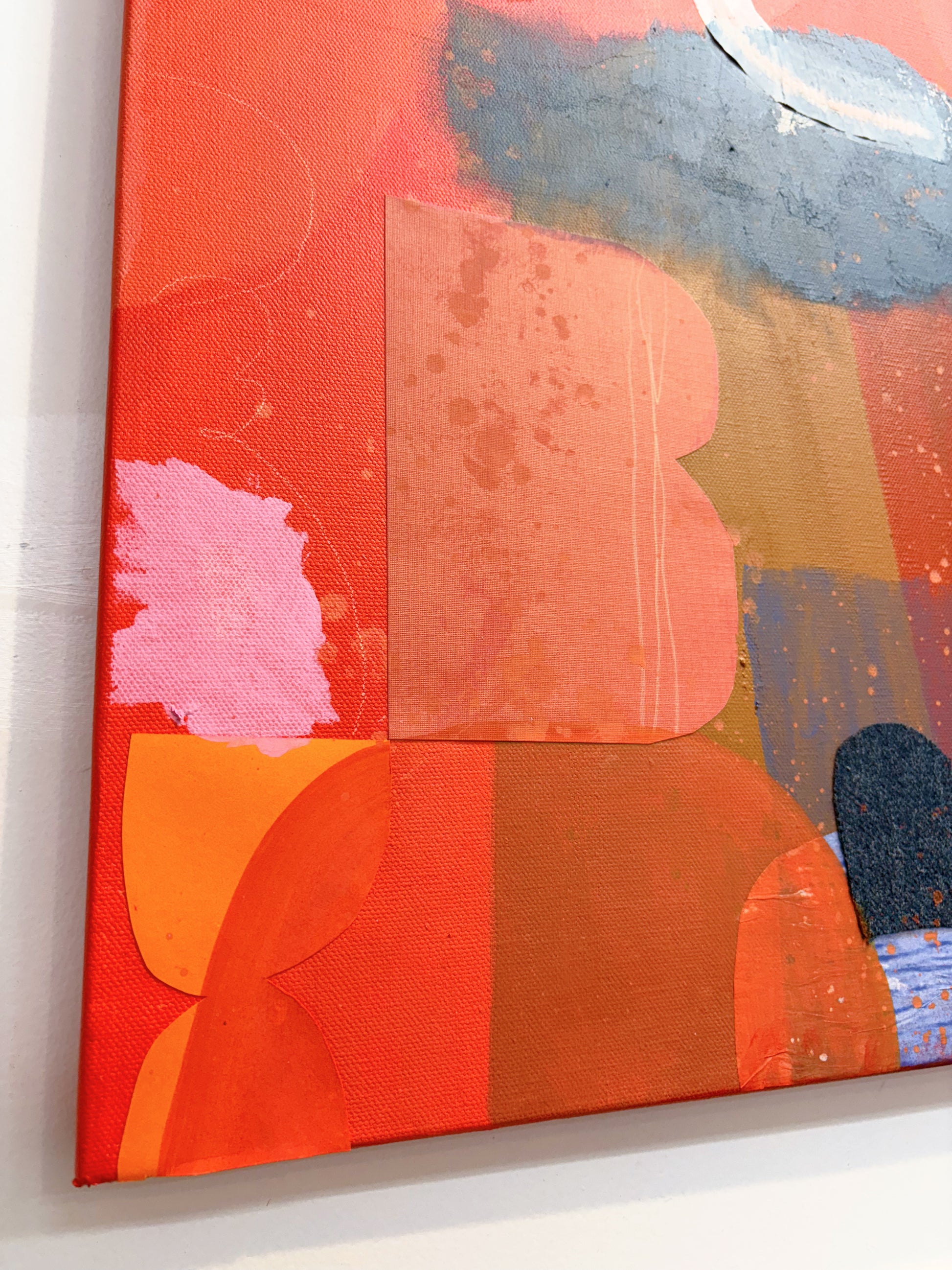 "Rock Island" is an original, mixed media painting created by Adrianne Hawthorne Thomas (Ponnopozz) in 2025. The painting was created with acrylic, gouache, oil pastel, colored pencil and collage. The piece is signed in the lower right corner and comes on stretched canvas.