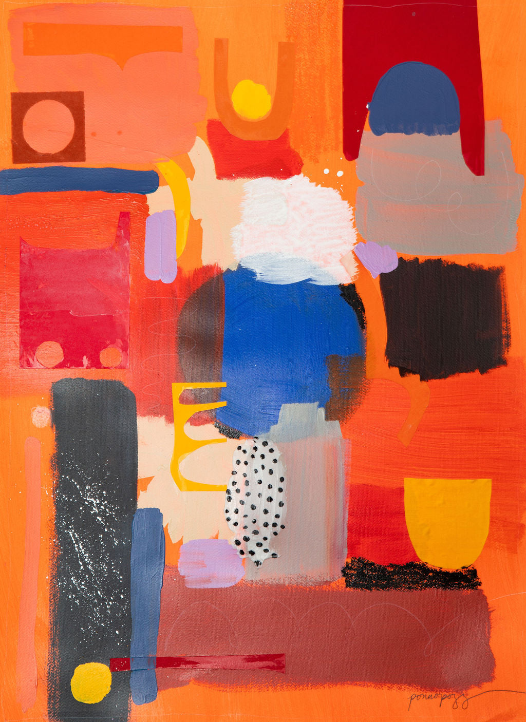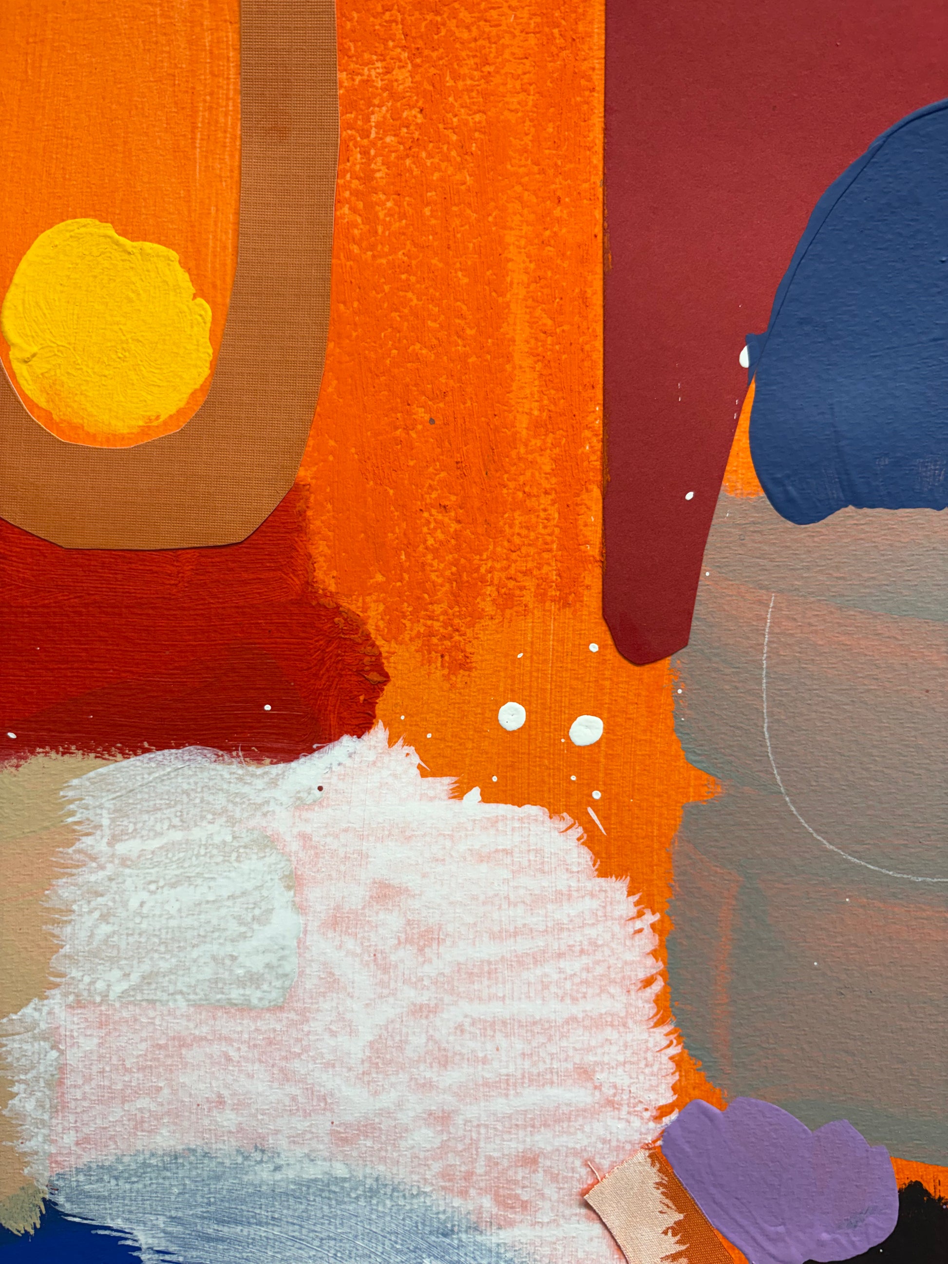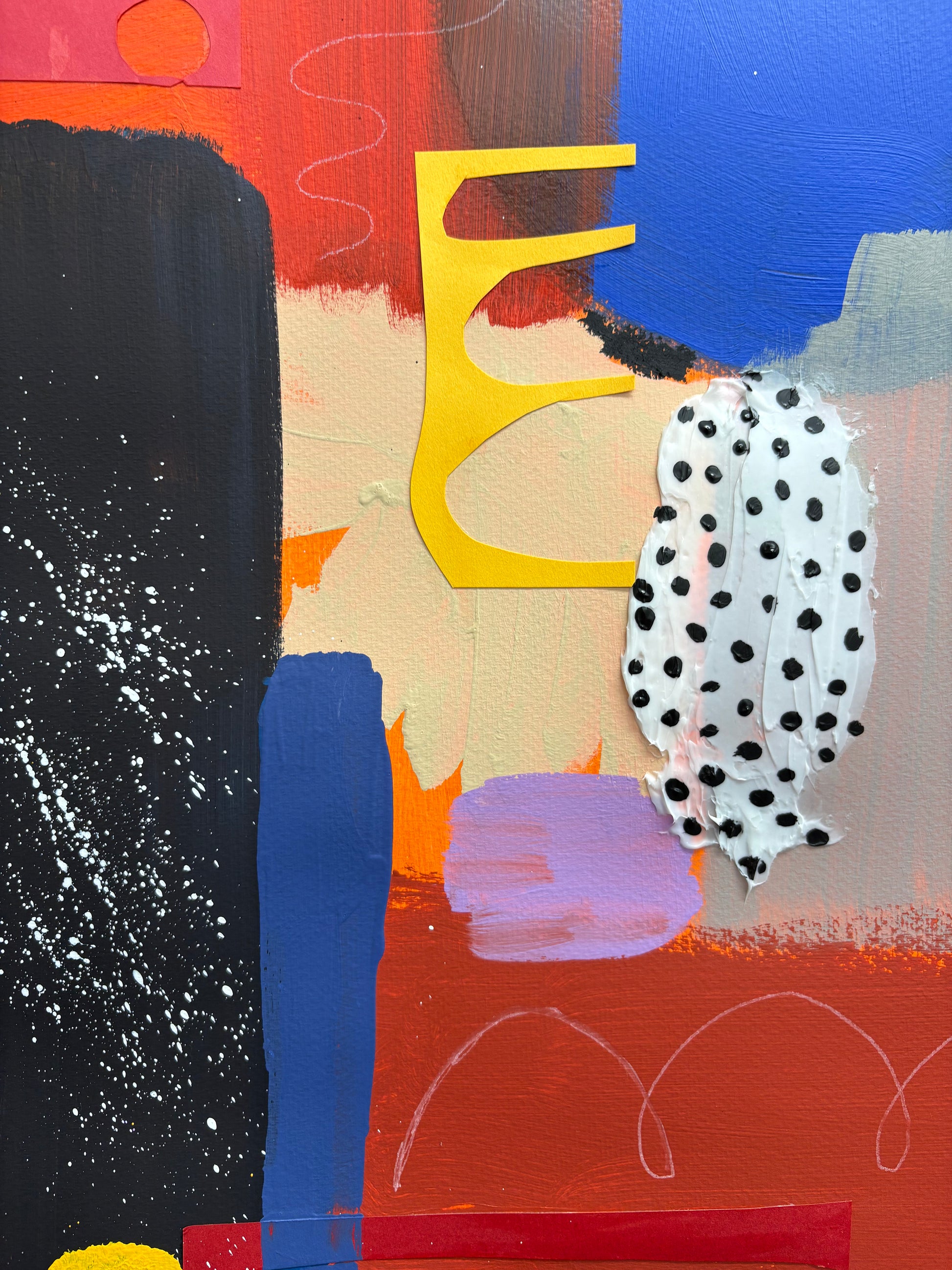 "South Shore Line" is an original, mixed media painting created by Adrianne Hawthorne Thomas (Ponnopozz) in 2025. The painting was created with acrylic, gouache, oil pastel, colored pencil and collage. The piece is signed in the lower right corner and comes on watercolor paper.