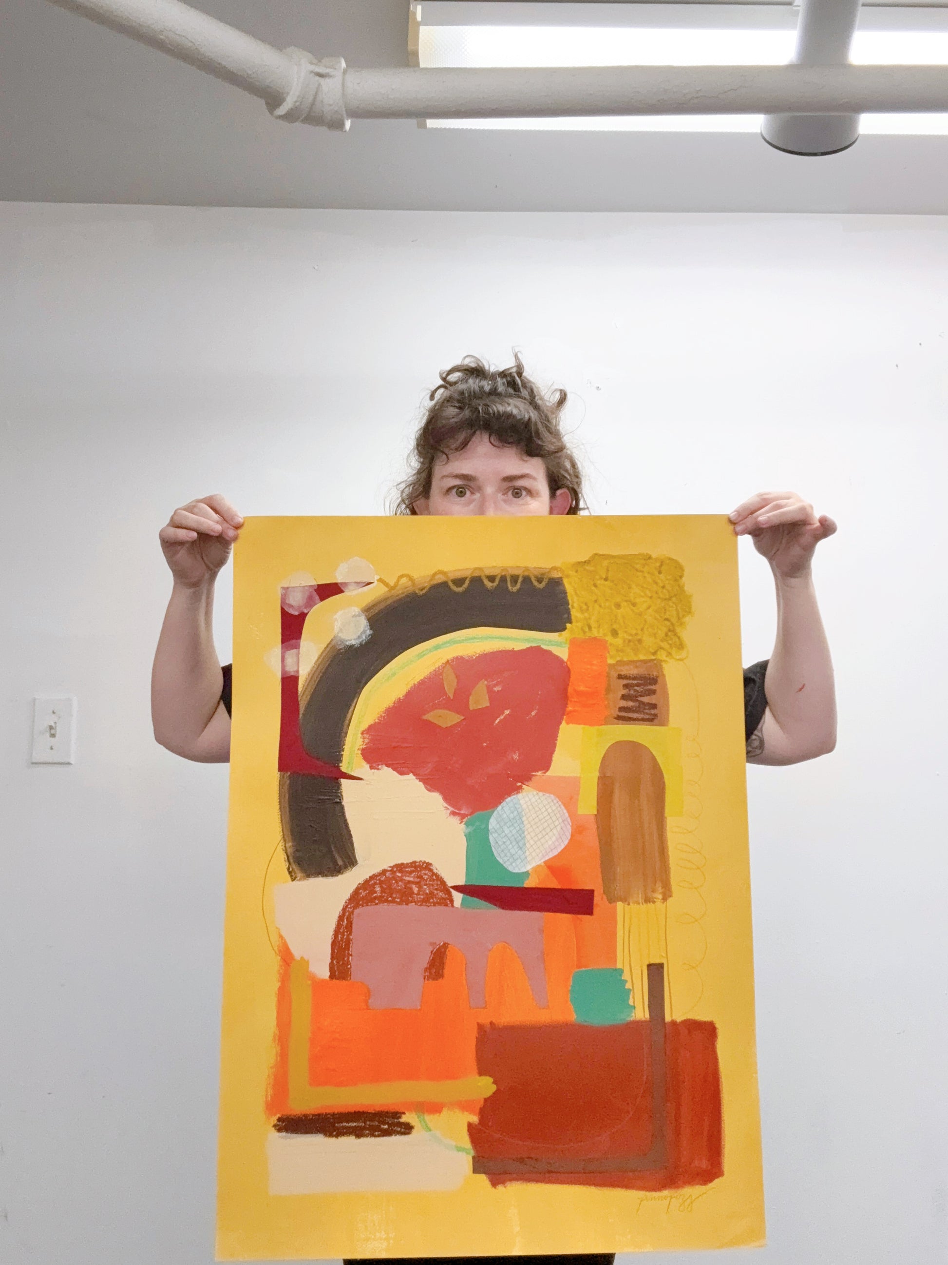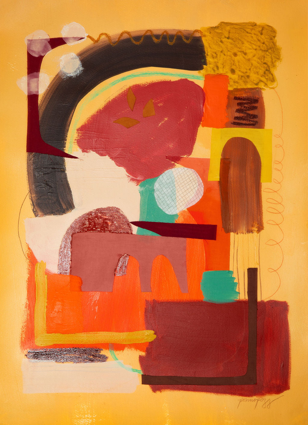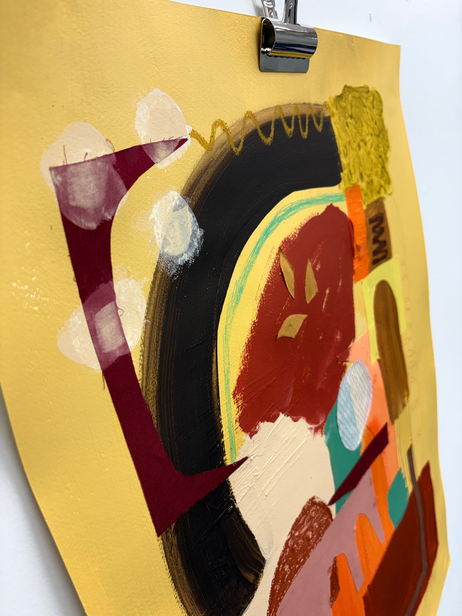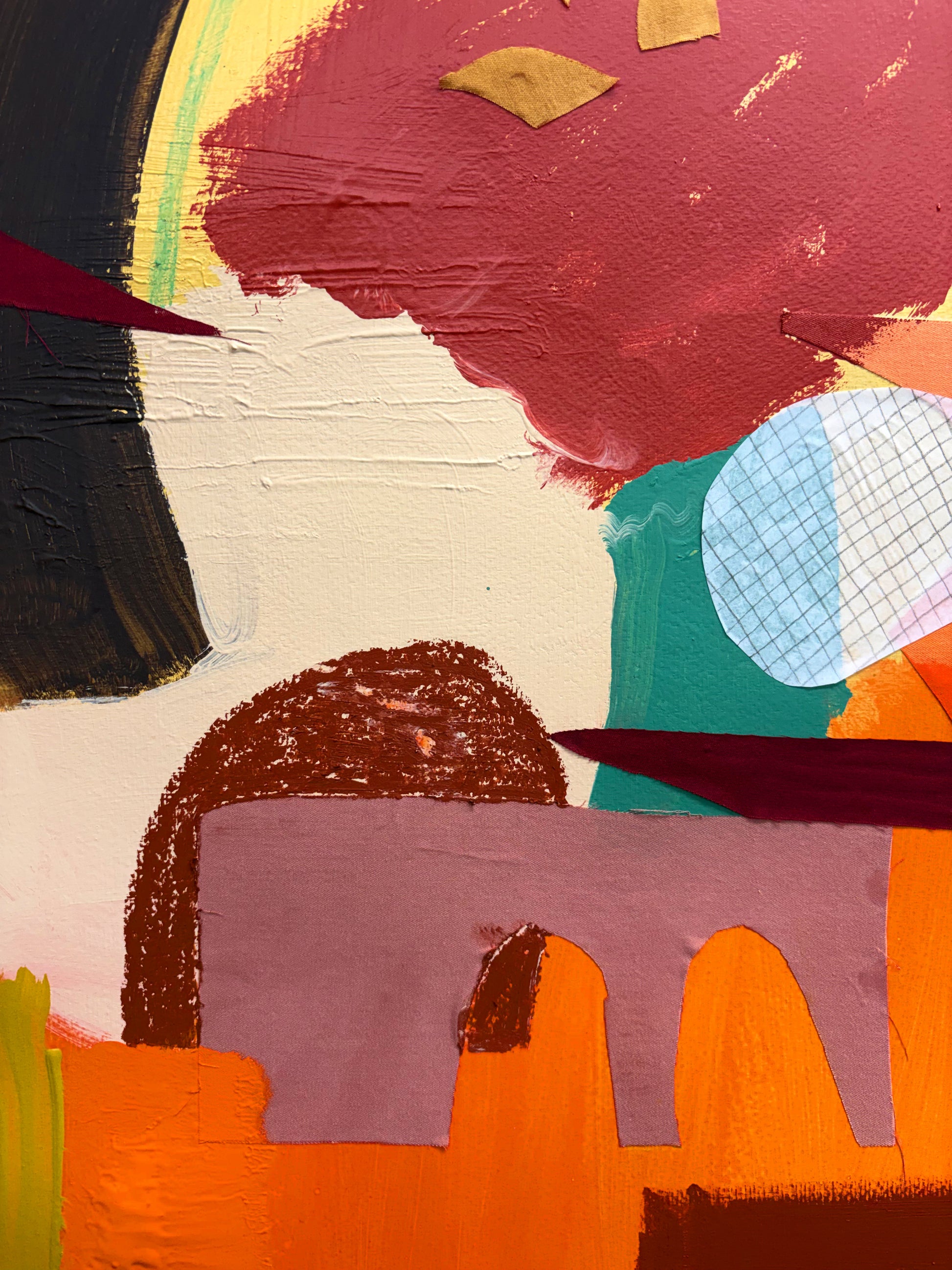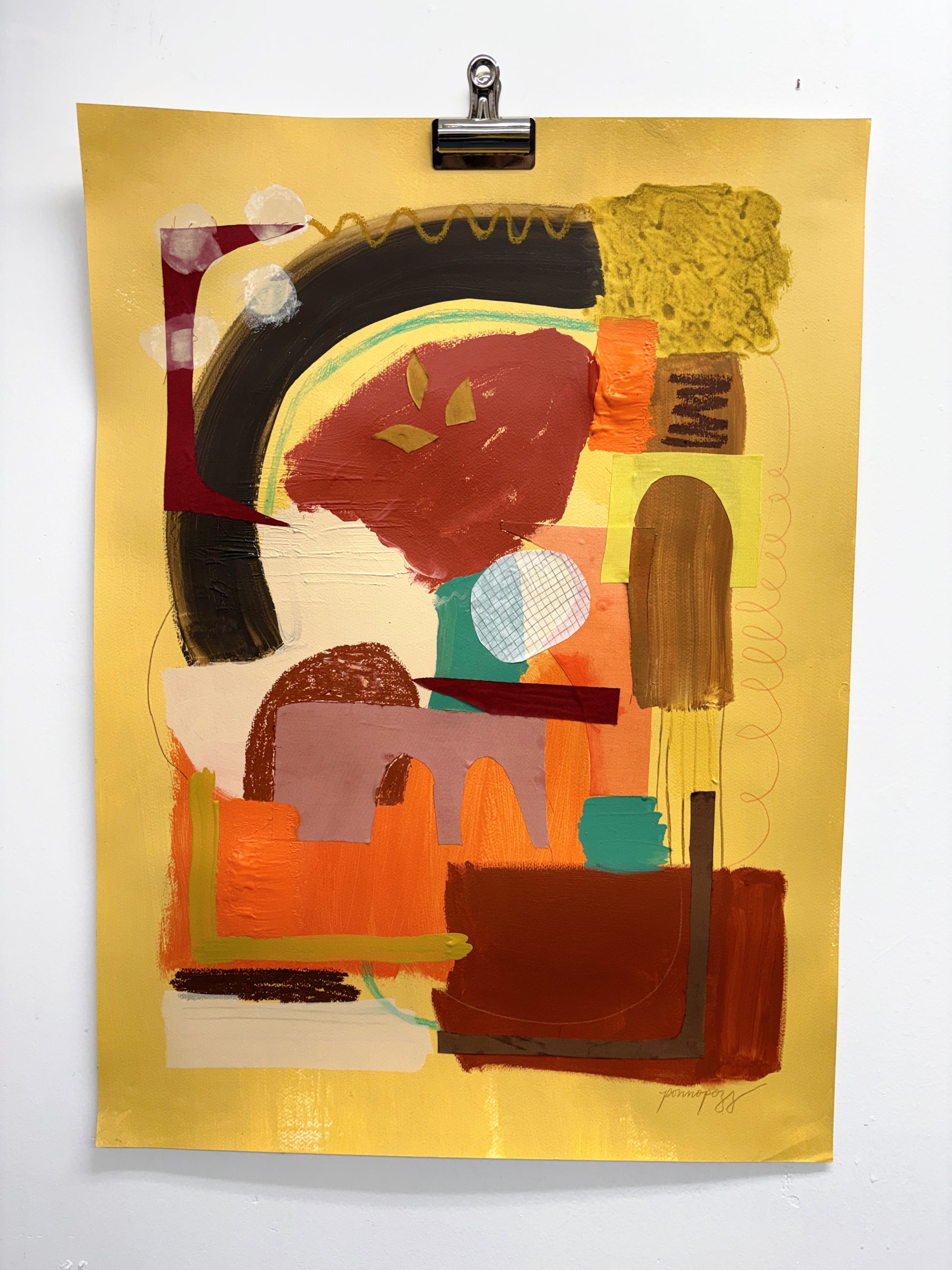 "Wisconsin Central" is an original, mixed media painting created by Adrianne Hawthorne Thomas (Ponnopozz) in 2025. The painting was created with acrylic, gouache, oil pastel, colored pencil and collage. The piece is signed in the lower right corner and comes on watercolor paper.